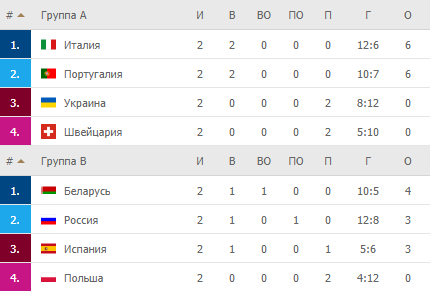 В первом туре подопечные Николая Костенко проигралисборной Португалии (5:7), азатем потерпели поражение от Италии (3:5).